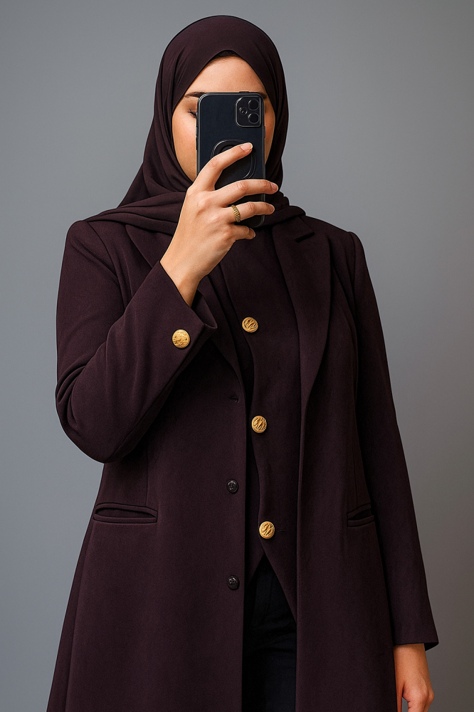 تألقي بإطلالة تجمع بين الفخامة و العملية مع عباية بليزر كريب بني المصنوعة من خامة الكريب الإندونيسي الفاخر تصميمها العصري مع الڤيست و الطرحة يمنحك خيارات متعددة تناسب المناسبات الرسمية و الطلعات اليومية.